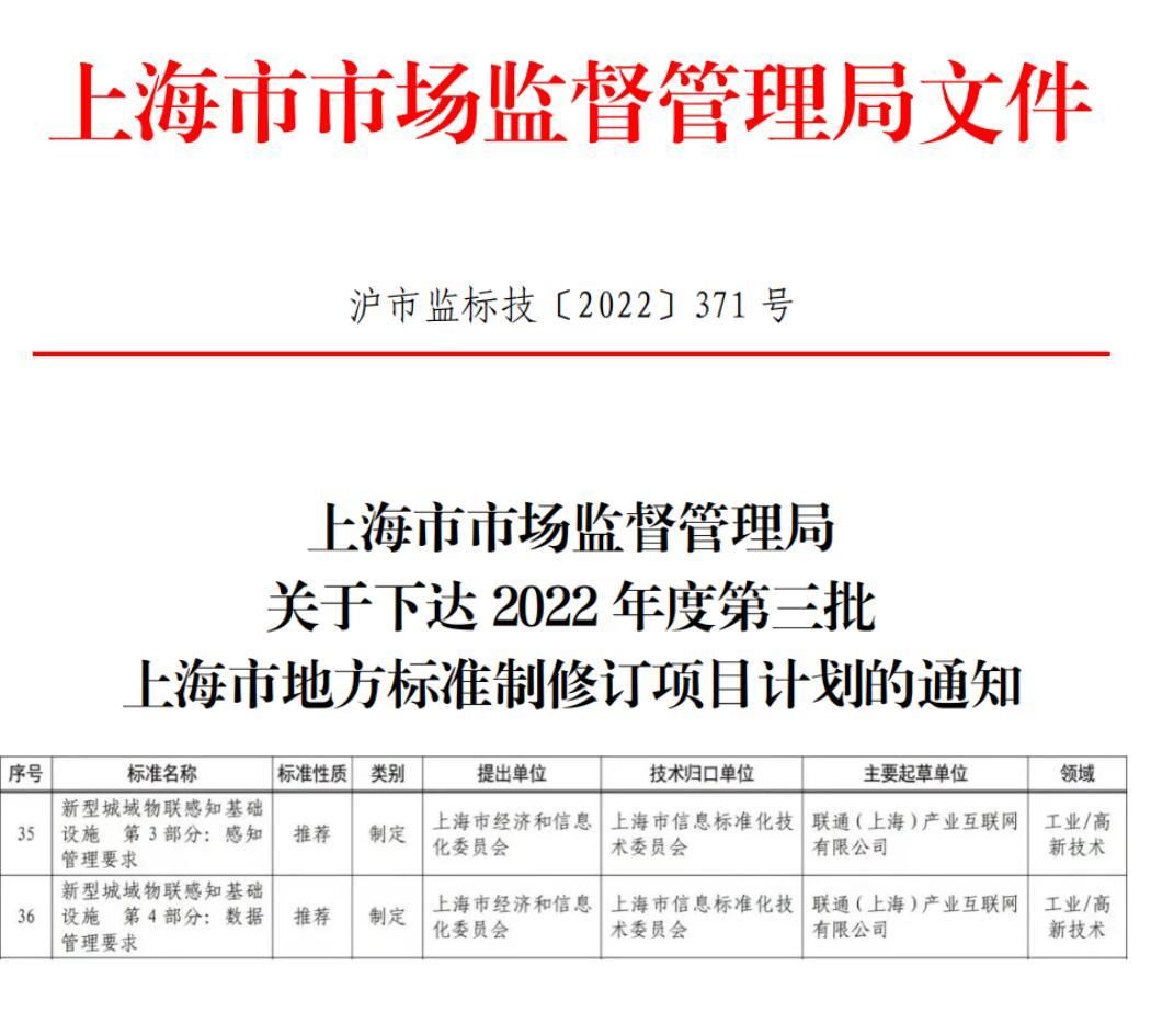 由联通(上海)产业互联网有限公司作为主起草单位,中国联合网络通信集团有限公司等共同起草和申请立项的两个上海市地方标准:《新型城域物联感知基础设施 第3部分:感知管理要求》、《新型城域物联感知基础设施第4部分:数据管理要求》于近日均已通过上海市市场监督管理局立项!